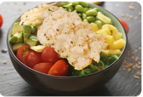 avocat, tomate, radis jaune, edamame, salade de choux, concombre, salade d algue sur un bol de riz vinaigré + soupe miso